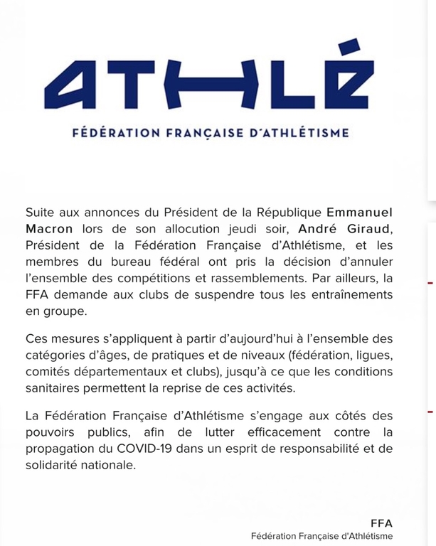 Par principe de précaution et à la demande de la FFA, tous les entraînements et les toutes les manifestations sont annulés à compter de ce jour et ce jusqu'à nouvel ordre.